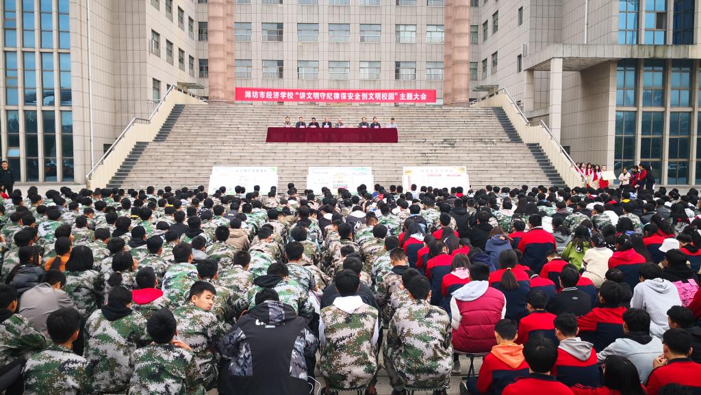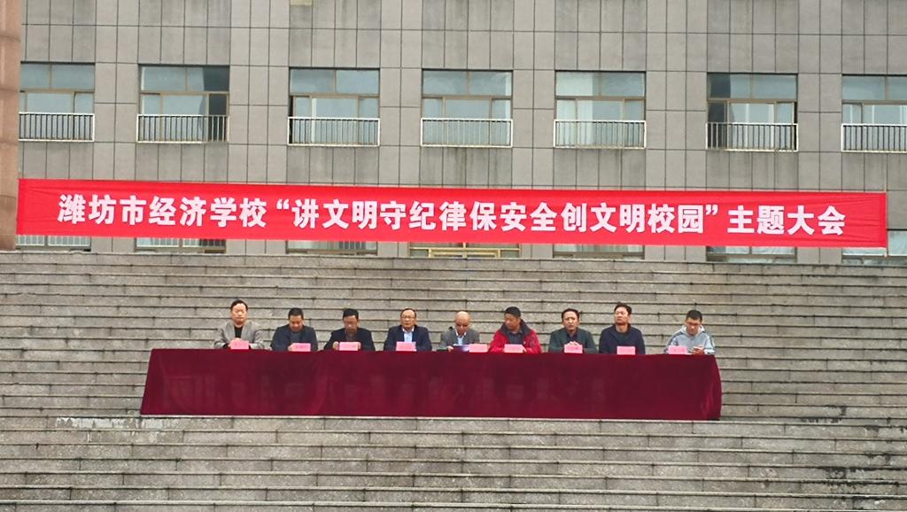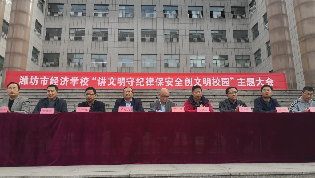 团委书记史成方宣读《潍坊市经济学校文明校园创建活动实施方案》,通过以“文明守纪争先创优 环境整洁健康成长”为主题的文明校园创建活动,提高校园文化生活质量,使校园秩序良好、环境优美,育人环境进一步改善。