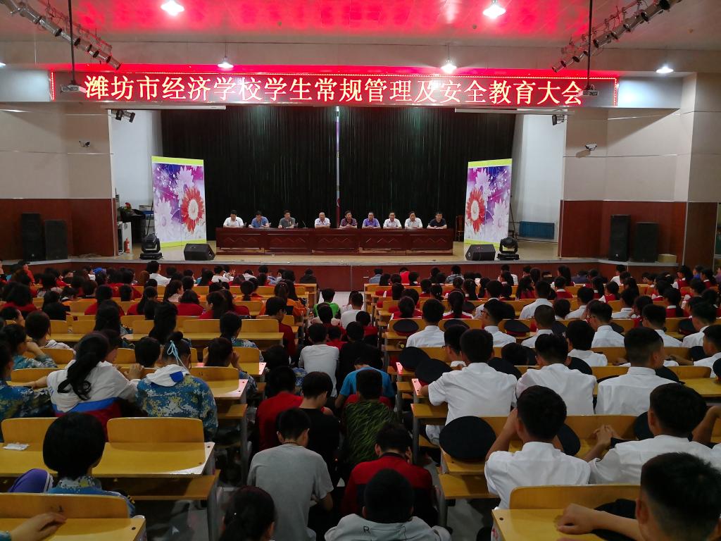 2018年5月29日,潍坊市经济学校学生常规管理及安全教育大会在学院第一报告厅召开,出席会议的领导有唐德良常务副校长,王海涛处长,李仁山副处长,史成方书记,各系主任、团总支书记及全体在校学生。会议由学生处王海涛处长主持。