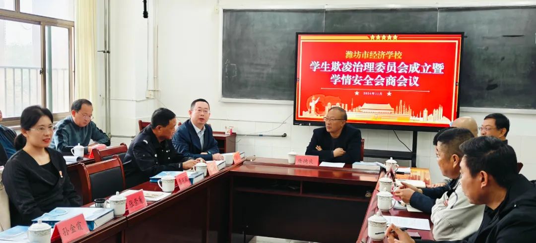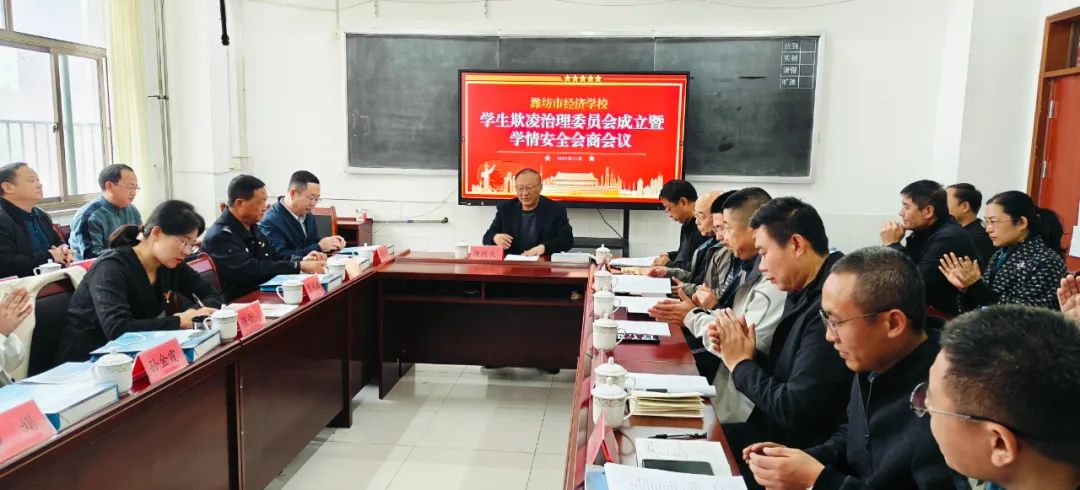 根据市教体局统一部署,经济学校重新修订了“潍坊市经济学校学生欺凌治理委员会”及工作要求、流程。为进一步提升校园安全管理水平,有效防范校园欺凌发生,近日,经研究,决定以学生欺凌治理委员会成立工作之机,一并召开学校学情、安全会商会议。