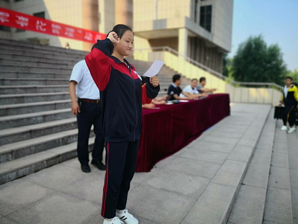 在誓师大会上,全校同学在宣誓人代表财经艺术系学生孙慧琳带领下集体宣誓:服从命令,听从指挥,遵纪守时,克难正己,挑战自我,磨练意志,争做文明守纪标兵,为班级添彩,为学校争光!学生宣誓声音洪亮,场面热烈,令人震撼,产生了极强的教育效果。