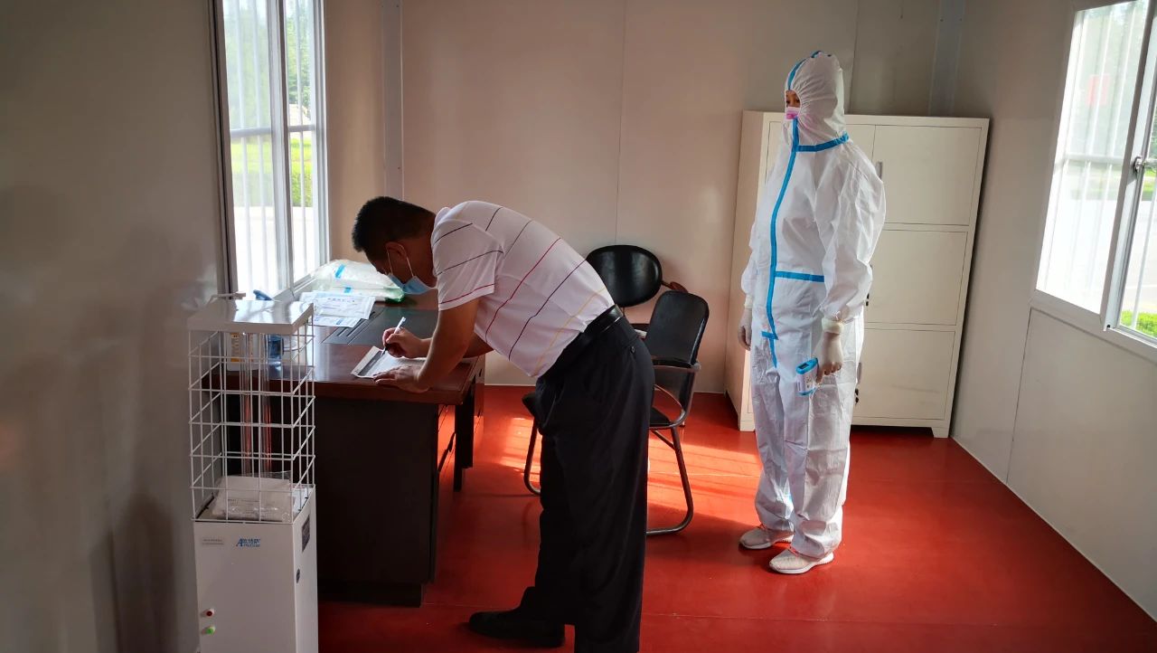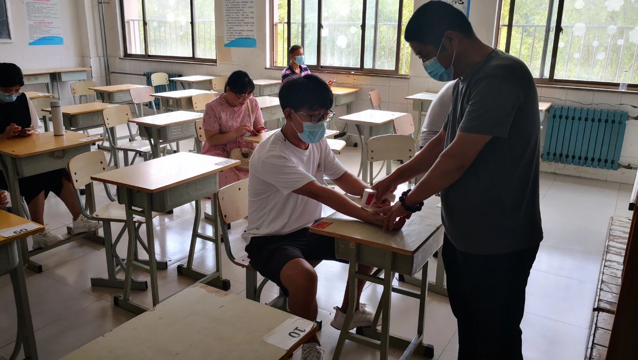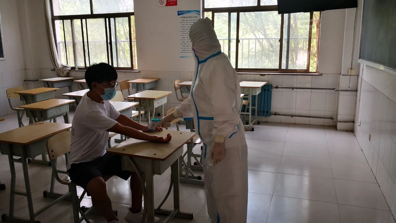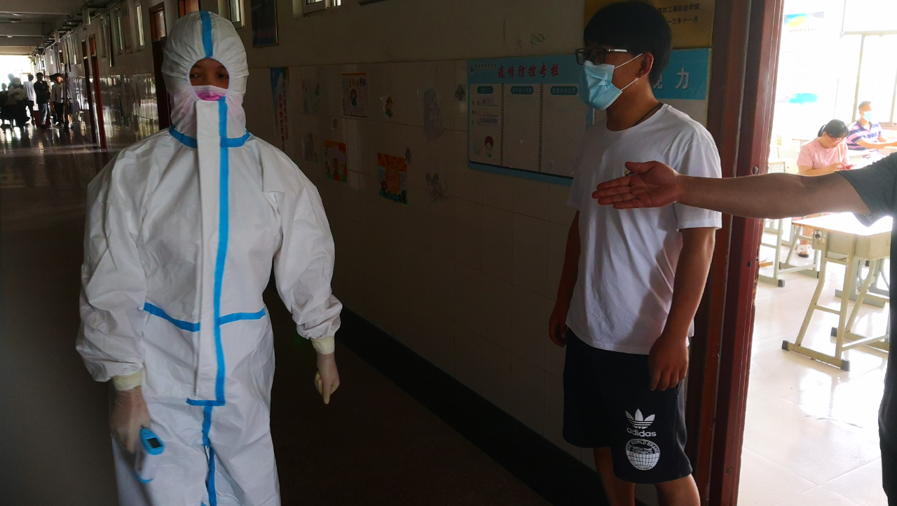 学生排队来到教室门口,班主任在教室门口为学生逐一测量体温并登记。进教室后,先进行手部消毒。教室内课桌按单人单桌摆放,每个座位间隔1米以上,教师上课或与学生谈话间隔大于1米。