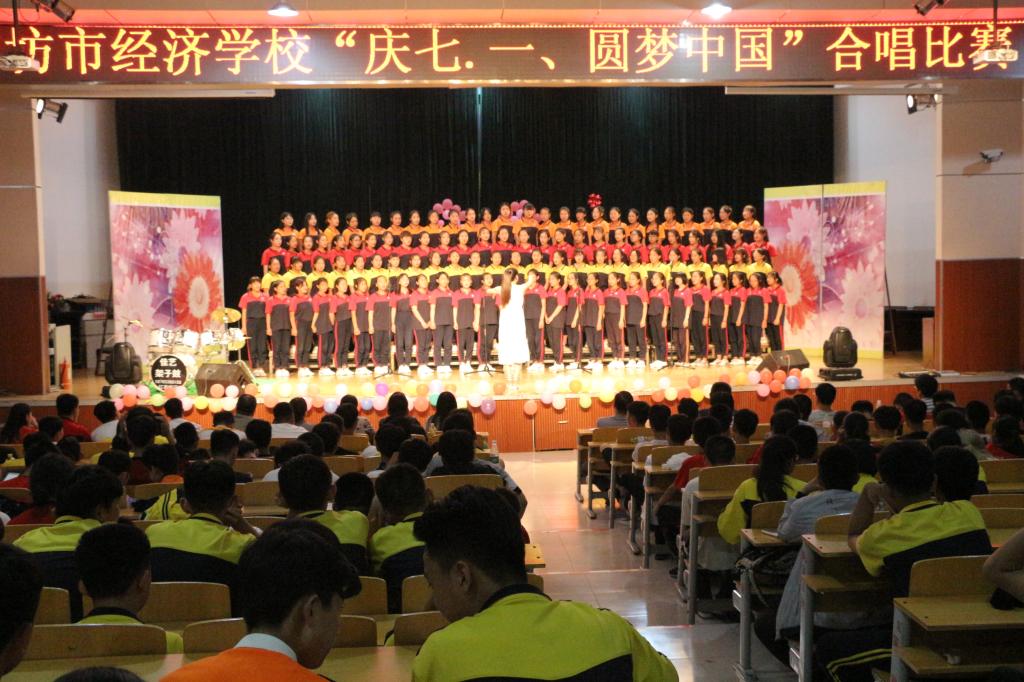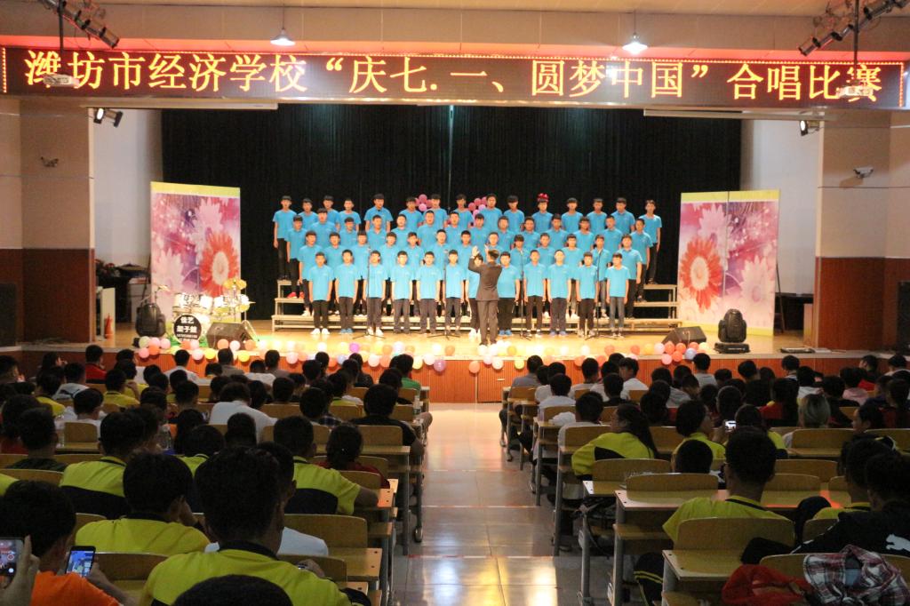2018年6月21日,潍坊市经济学校“庆七一、圆梦中国”合唱比赛在第一报告厅举行。潍坊工商职业学院党委书记、潍坊市经济学校校长郑志松同志,潍坊市经济学校常务副校长唐德良同志,各系部处室领导、老师及全体在校学生参加了活动。