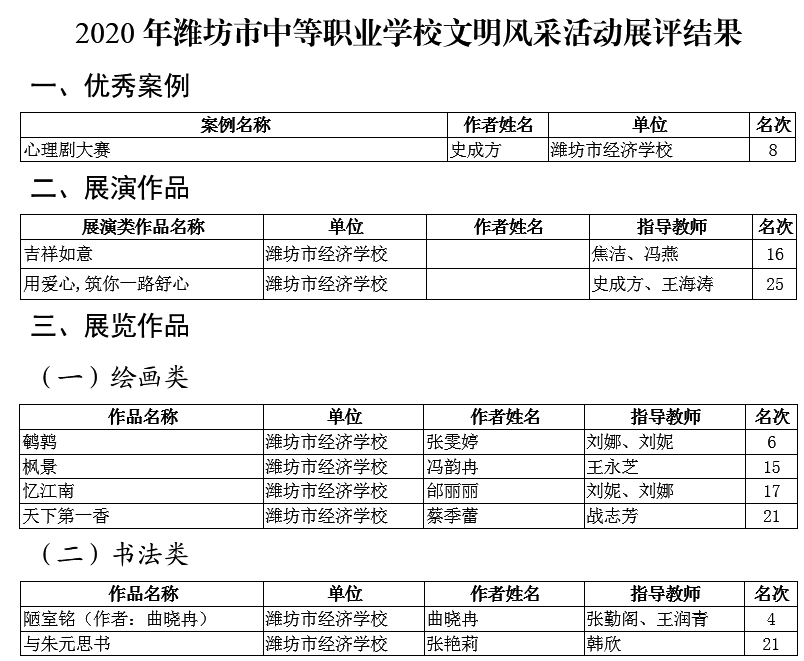 在本次展演中,我校通过校级评审,共报送师生作品47件,潍坊教育局通过网上投票占20%,专家评分占80%的评价方式进行评比。我校共有13件作品被评为优秀作品。其中史成方老师指导的手工艺作品《蝶恋花》代表潍坊参加山东省文明风采作品展演。