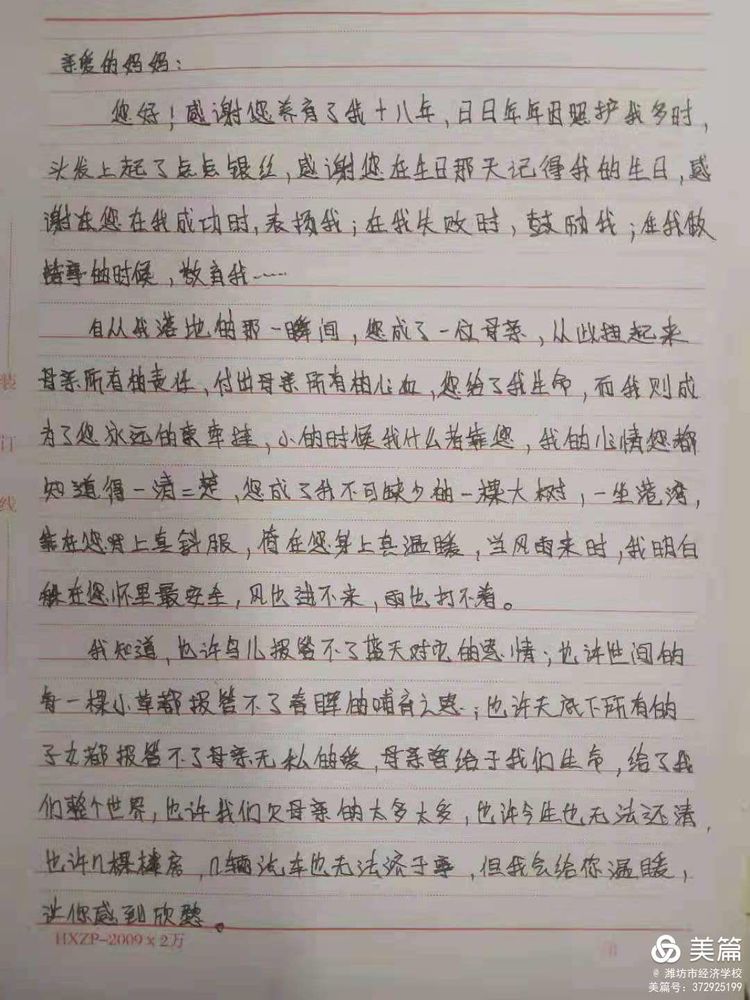 都说母爱是有终点的,我深信,母爱是取之不尽的,用之不竭的。母亲,世界上最伟大的人,您-为了我付出一切无怨无悔;您为了我的身心健康默默贡献;您-是我心中的明灯,照亮我前进的道路;您-是一颗大树,让我在树下享受绿茵,无忧无虑。妈妈是所有孩子都有的,可有谁会体会她的辛苦,您为了我过得更好独自一人那辛苦的洗礼。您看着我笑您心里会默默为我高兴。