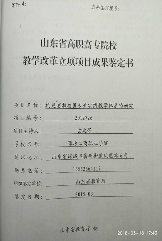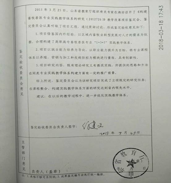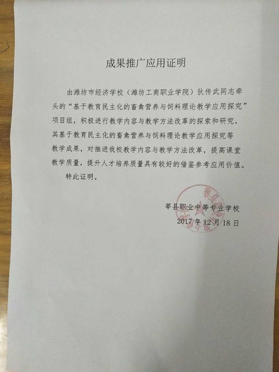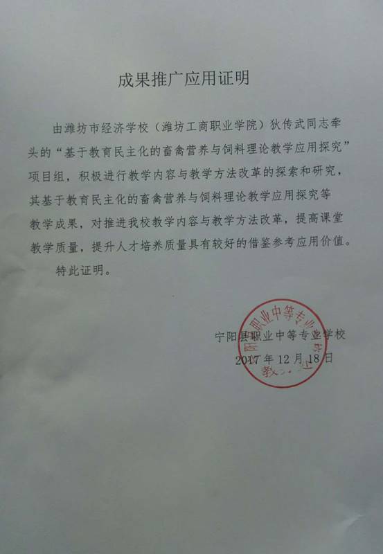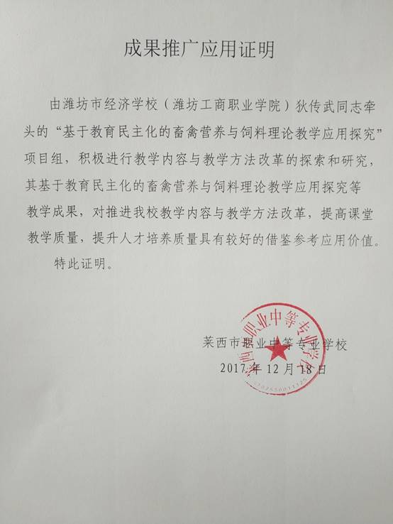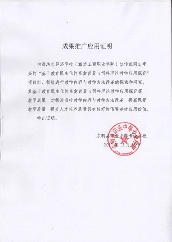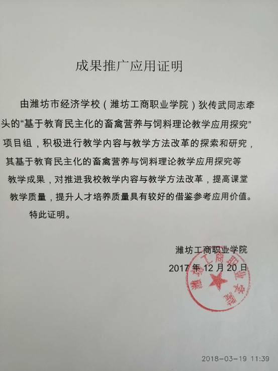鉴定意见: 2018年 3 月20日,全国生物技术职业教育专业建设委员会(推荐单位)组织专家对“基于教育民主化的畜禽营养与饲料理论教学应用探究”教学成果进行了鉴定。经评议,形成以下意见: 1、先进性强。该项教学方法的改革创新,符合素质教育要求,在同行业中处于领先地位。 2、实用性、可操作强。民主化课堂,发挥学生主体作用,引导学生思维和探究,使本来枯燥乏味、晦涩难懂的专业基础理论教学,变得迎刃而解。学生学习专业知识的自觉性和主动性都得以发展和提升。 3、特色鲜明。让学生体验探究和发现的愉悦,对于树立专业思想,培养专业学习兴趣,对于具有职业教育特色的反映新知识、新技术、新工艺和新方法的职业教育课程和教材学生接受快,起到了事半功倍的效果。 4、教学质量显著提高。改变了教师主宰课堂,以教师为中心的传统教学方式;解放学生,促进学生个性的发展和潜能的开发,对于培养学生的创新精神和实践能力,全面提升学生综合素质具有重要意义。 综上所述,该成果思路清晰,特色鲜明,实用性、可操作性强,在专业基础理论的课堂教学中有创新,在教材教法上有突破,对于教会学生学习,提高学生专业素养,深化教学方法改革起到了重要的助推作用,该成果已在省内外多家中高职院校推广应用,对于其他中高职院校专业基础理论课堂教学方法改革具有很好示范和引领作用,达到了国内领先水平。 专家组一致同意推荐全国教学成果 二等奖。 鉴定组织负责人: 2018年3月28日 |