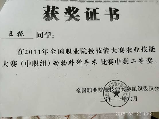 (1)2011年6月,我校刘小梅、王栋两同学参加全国中职组“动物外科手术项目”获得全国第三名二等奖的好成绩。