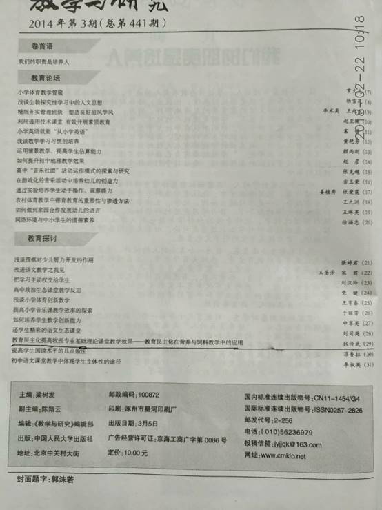 通过教育教学实践得知:教育民主就是把教育过程变成一种民主的生活方式,结合本学科特点,尊重学生的主体地位,使得学生生动活泼、自由自主的发展;提高学生的民主意识和参与能力,发挥学生的主体作用,让学生参与知识结构的讨论和探究,提高学习兴趣;让学生在平等和谐的氛围之下,接受知识于春风化雨中。
