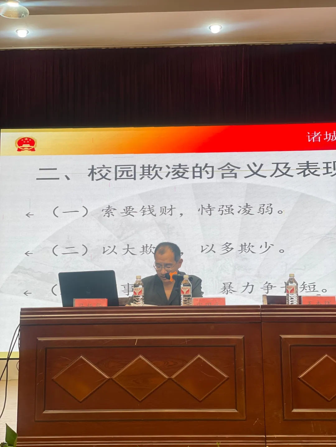 在法治宣讲中,诸城市人民法院马振华结合未成年的年龄特点、心理特征、知识结构等方面,用通俗易懂的语言,向参加活动的潍坊市经济学校全校师生讲解了《刑法》、《民法典》、《未成年人保护法》及《预防未成年犯罪法》等相关法律常识,并结合青少年犯罪的典型案例,提示学生在校期间应避免的不良行为,宣讲违法行为与犯罪行为的联系,使广大师生深刻理解宪法的基本原则和精神,尊法明理,拥护宪法,增强自我防范保护和遵纪守法的法治意识。