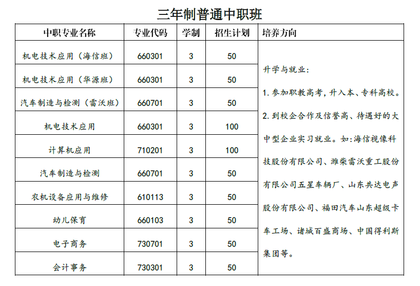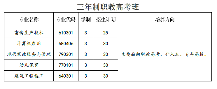 (1)职教高考班面向本县应届初中毕业生,三年制中职面向全省招收应、往届初中毕业生。
